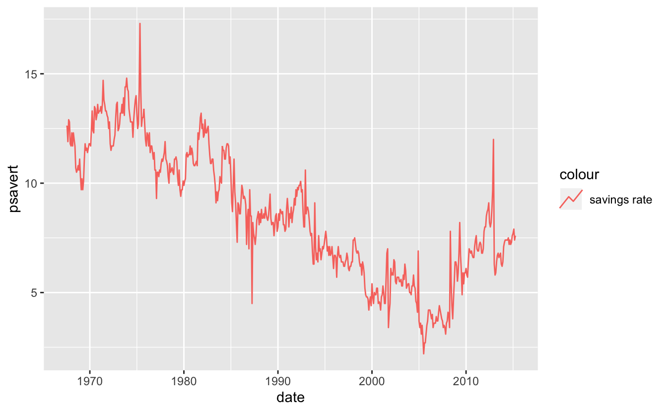 ggplot(economics, aes(date, psavert, color = "savings rate")) +