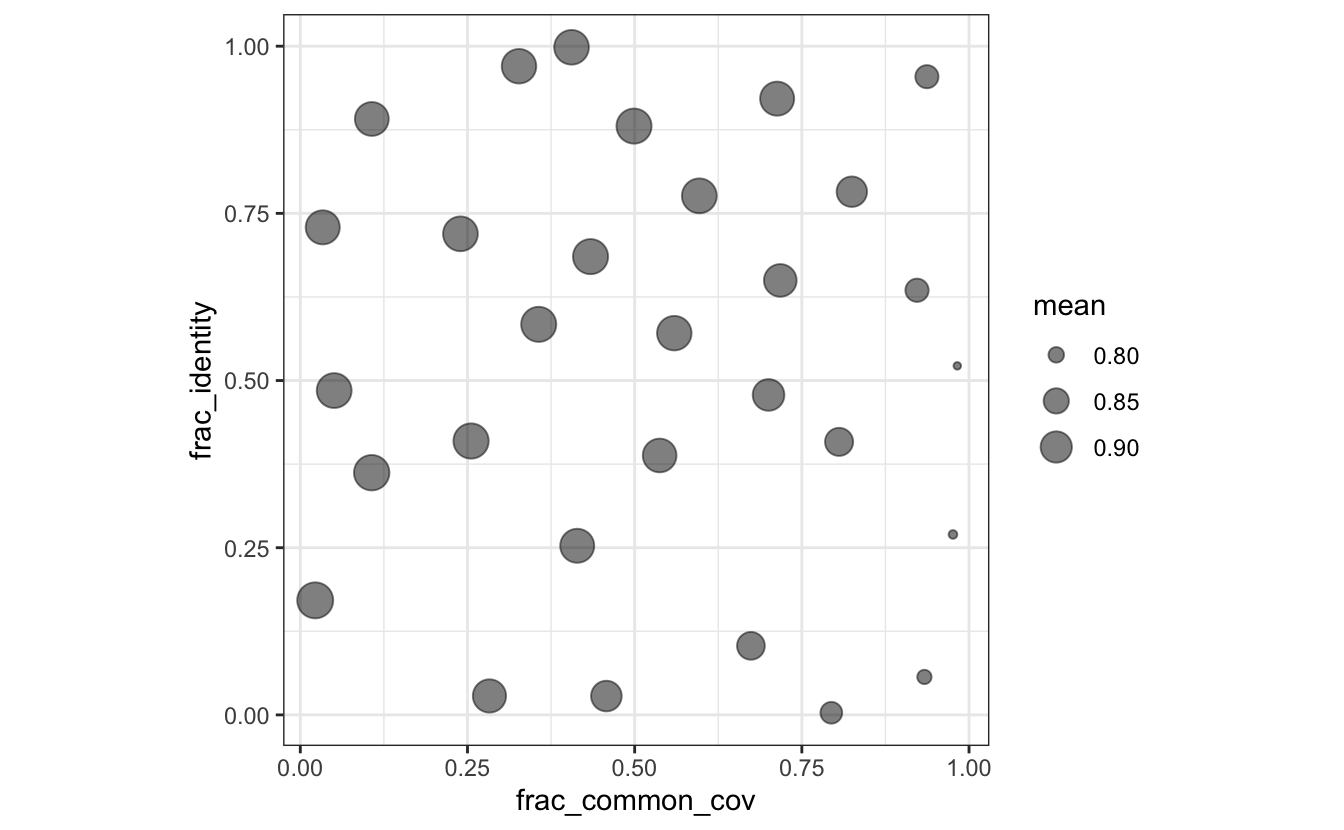 ggplot(auc_values, aes(x = frac_common_cov, y = frac_identity, size = mean)) +